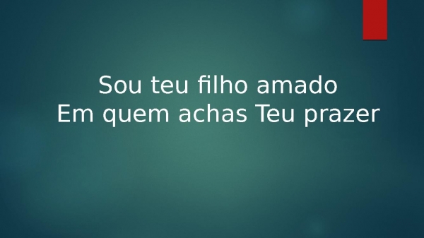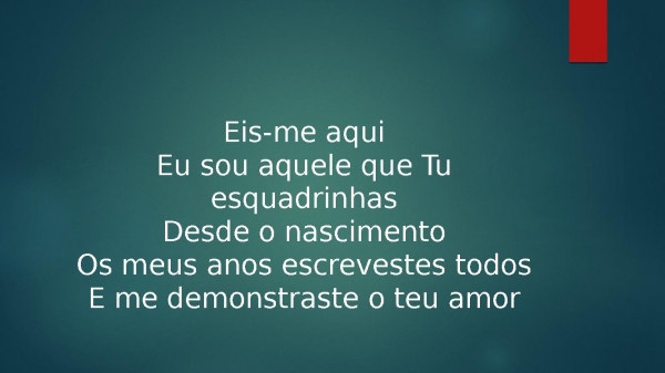 - Eis-me aquiEu sou aquele que Tu esquadrinhasDesde o nascimentoOs meus anos escrevestes todosE me demonstraste o teu amor