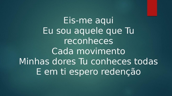 - Eis-me aquiEu sou aquele que Tu reconhecesCada movimentoMinhas dores Tu conheces todasE em ti espero redenção