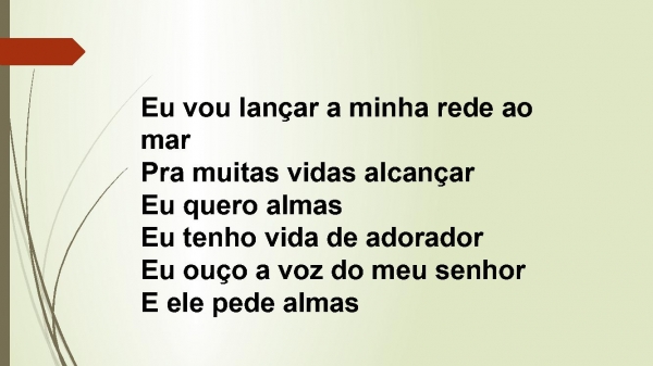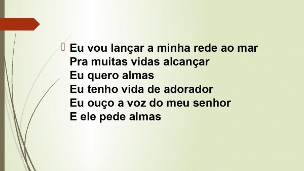 - Eu vou lançar a minha rede ao marPra muitas vidas alcançarEu quero almasEu tenho vida de adoradorEu ouço a voz do meu senhorE ele pede almas