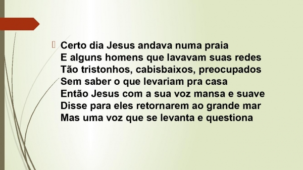 - Certo dia Jesus andava numa praiaE alguns homens que lavavam suas redesTão tristonhos, cabisbaixos, preocupadosSem saber o que levariam pra casaEntão Jesus com a sua voz mansa e suaveDisse para eles retornarem ao grande marMas uma voz que se levanta e questiona