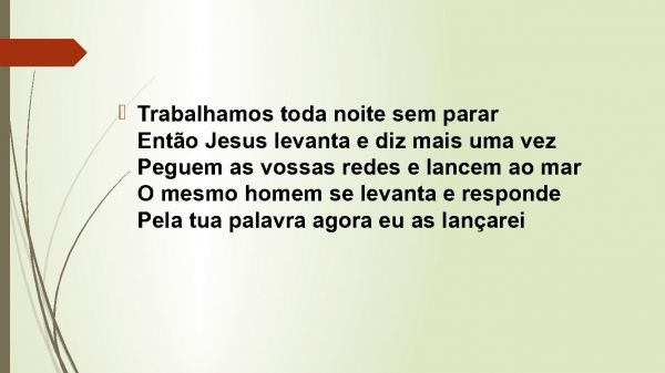 - Trabalhamos toda noite sem pararEntão Jesus levanta e diz mais uma vezPeguem as vossas redes e lancem ao marO mesmo homem se levanta e respondePela tua palavra agora eu as lançarei