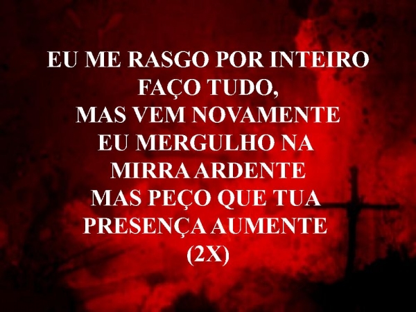- EU ME RASGO POR INTEIROFAÇO TUDO,MAS VEM NOVAMENTEEU MERGULHO NA MIRRA ARDENTEMAS PEÇO QUE TUA PRESENÇA AUMENTE (2X)