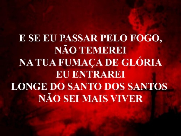 - E SE EU PASSAR PELO FOGO,NÃO TEMEREINA TUA FUMAÇA DE GLÓRIAEU ENTRAREILONGE DO SANTO DOS SANTOS NÃO SEI MAIS VIVER