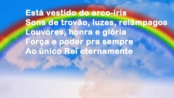 - Está vestido do arco-írisSons de trovão, luzes, relâmpagosLouvores, honra e glóriaForça e poder pra sempreAo único Rei eternamente