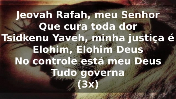 - Jeovah Rafah, meu SenhorQue cura toda dorTsidkenu Yaveh, minha justiça éElohim, Elohim DeusNo controle está meu DeusTudo governa(3x)