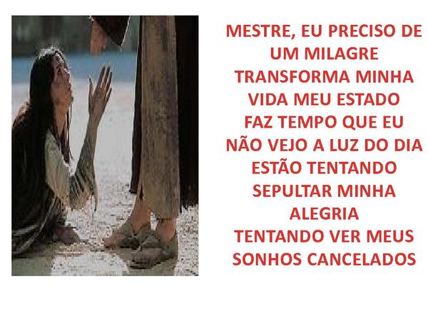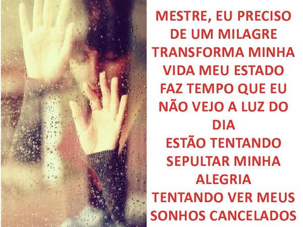 - MESTRE, EU PRECISO DE UM MILAGRETRANSFORMA MINHA VIDA MEU ESTADOFAZ TEMPO QUE EU NÃO VEJO A LUZ DO DIAESTÃO TENTANDO SEPULTAR MINHA ALEGRIATENTANDO VER MEUS SONHOS CANCELADOS