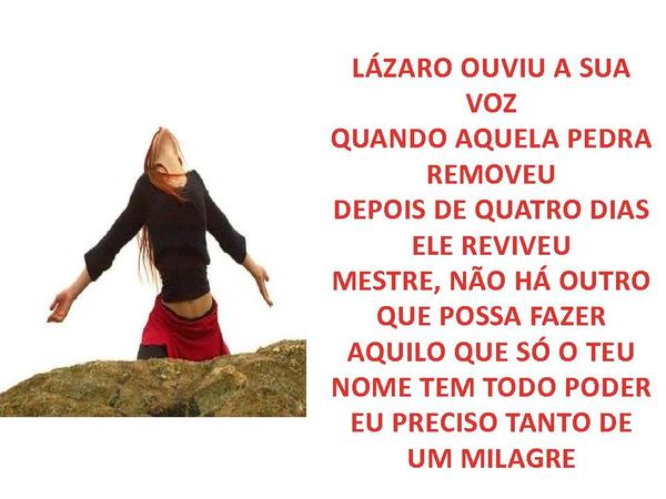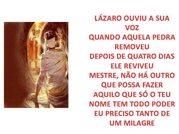 - LÁZARO OUVIU A SUA VOZQUANDO AQUELA PEDRA REMOVEUDEPOIS DE QUATRO DIAS ELE REVIVEUMESTRE, NÃO HÁ OUTRO QUE POSSA FAZERAQUILO QUE SÓ O TEU NOME TEM TODO PODEREU PRECISO TANTO DE UM MILAGRE