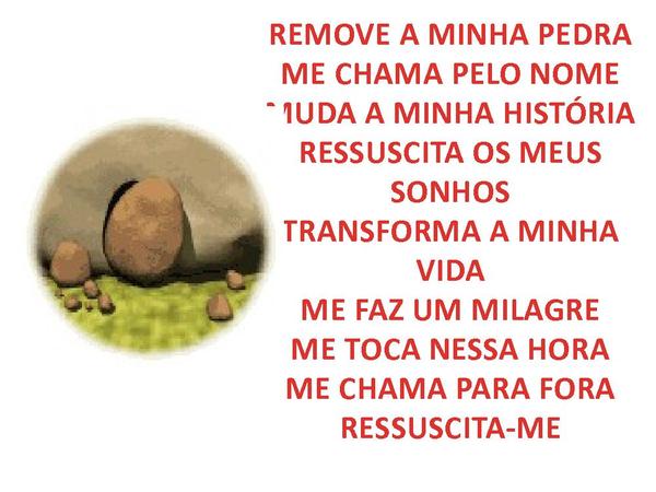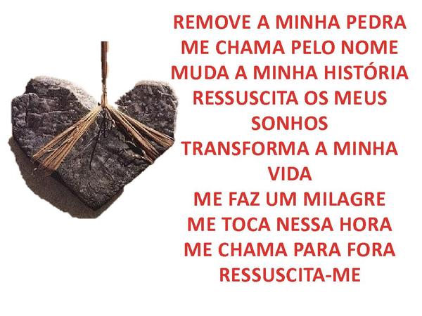 - REMOVE A MINHA PEDRAME CHAMA PELO NOMEMUDA A MINHA HISTÓRIARESSUSCITA OS MEUS SONHOSTRANSFORMA A MINHA VIDAME FAZ UM MILAGREME TOCA NESSA HORAME CHAMA PARA FORARESSUSCITA-ME