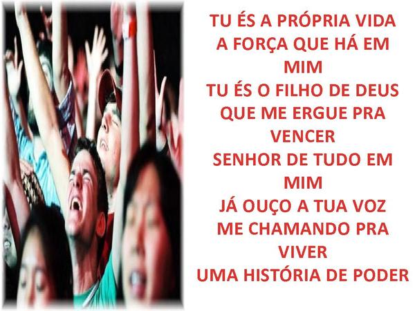 - TU ÉS A PRÓPRIA VIDAA FORÇA QUE HÁ EM MIMTU ÉS O FILHO DE DEUSQUE ME ERGUE PRA VENCERSENHOR DE TUDO EM MIMJÁ OUÇO A TUA VOZME CHAMANDO PRA VIVERUMA HISTÓRIA DE PODER