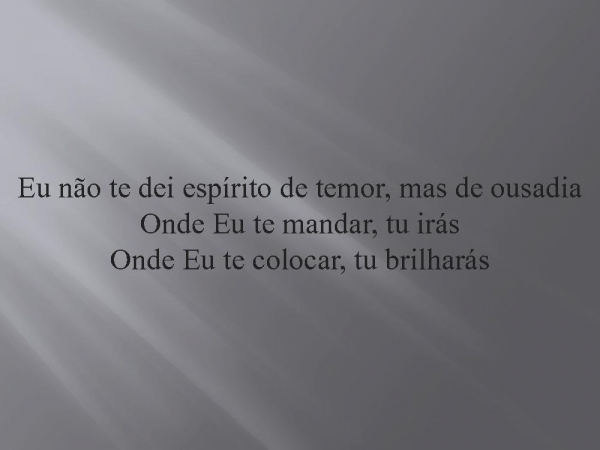 - Eu não te dei espírito de temor, mas de ousadiaOnde Eu te mandar, tu irásOnde Eu te colocar, tu brilharás