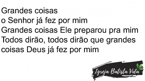 - Grandes coisas o Senhor já fez por mimGrandes coisas Ele preparou pra mimTodos dirão, todos dirão que grandes coisas Deus já fez por mim