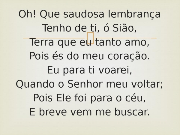 - Oh! Que saudosa lembrançaTenho de ti, ó Sião,Terra que eu tanto amo,Pois és do meu coração.Eu para ti voarei,Quando o Senhor meu voltar;Pois Ele foi para o céu,E breve vem me buscar.
