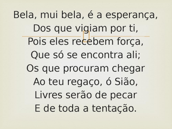 - Bela, mui bela, é a esperança,Dos que vigiam por ti,Pois eles recebem força,Que só se encontra ali;Os que procuram chegarAo teu regaço, ó Sião,Livres serão de pecarE de toda a tentação.