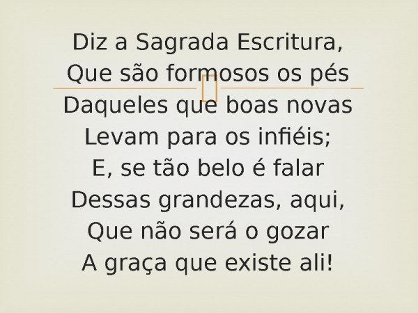 - Diz a Sagrada Escritura,Que são formosos os pésDaqueles que boas novasLevam para os infiéis;E, se tão belo é falarDessas grandezas, aqui,Que não será o gozarA graça que existe ali!