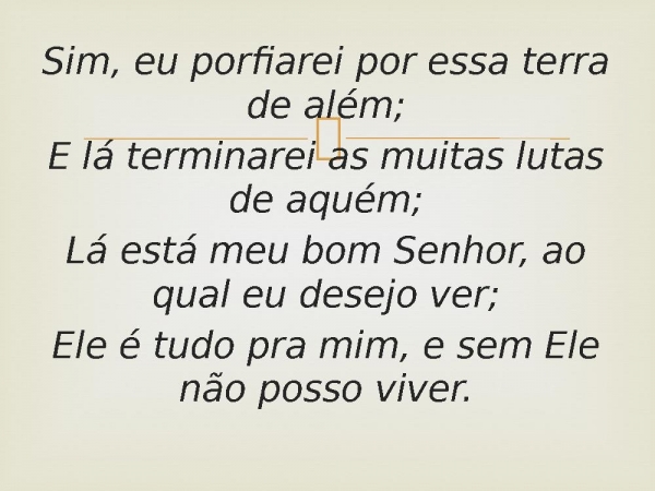 - Sim, eu porfiarei por essa terra de além;E lá terminarei as muitas lutas de aquém;Lá está meu bom Senhor, ao qual eu desejo ver;Ele é tudo pra mim, e sem Ele não posso viver.