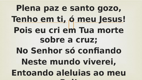 - Plena paz e santo gozo,Tenho em ti, ó meu Jesus!Pois eu cri em Tua morte sobre a cruz;No Senhor só confiandoNeste mundo viverei,Entoando aleluias ao meu Rei!