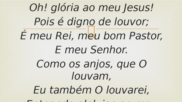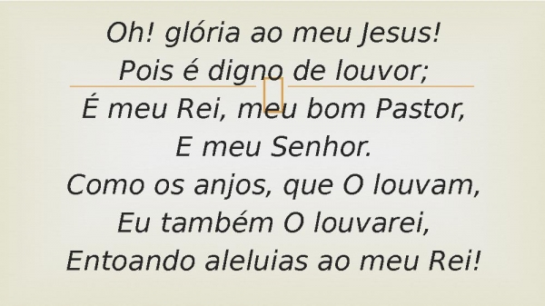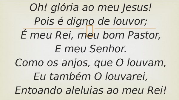 - Oh! glória ao meu Jesus!Pois é digno de louvor;É meu Rei, meu bom Pastor,E meu Senhor.Como os anjos, que O louvam,Eu também O louvarei,Entoando aleluias ao meu Rei!