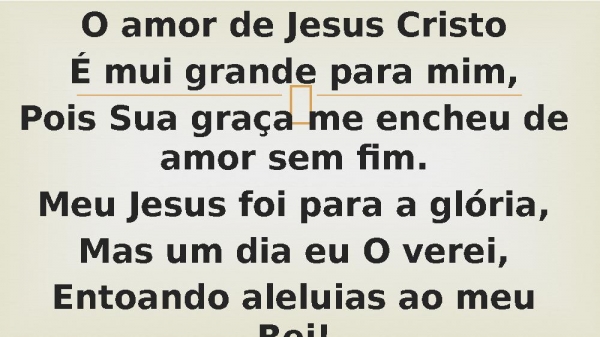 - O amor de Jesus CristoÉ mui grande para mim,Pois Sua graça me encheu de amor sem fim.Meu Jesus foi para a glória,Mas um dia eu O verei,Entoando aleluias ao meu Rei!