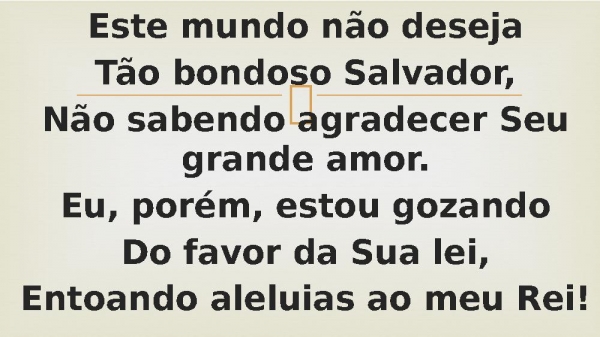 - Este mundo não desejaTão bondoso Salvador,Não sabendo agradecer Seu grande amor.Eu, porém, estou gozandoDo favor da Sua lei,Entoando aleluias ao meu Rei!