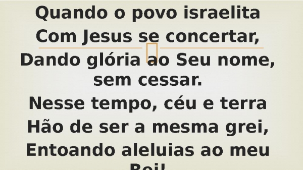 - Quando o povo israelitaCom Jesus se concertar,Dando glória ao Seu nome, sem cessar.Nesse tempo, céu e terraHão de ser a mesma grei,Entoando aleluias ao meu Rei!