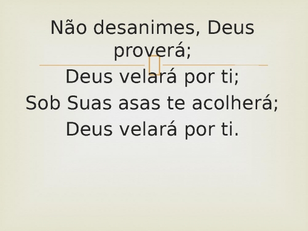 - Não desanimes, Deus proverá;Deus velará por ti;Sob Suas asas te acolherá;Deus velará por ti.
