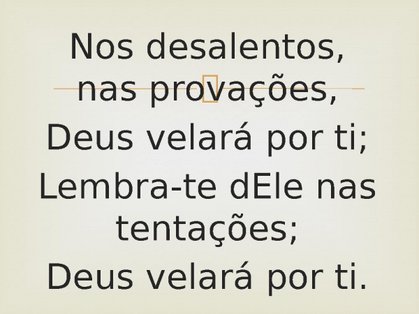 - Nos desalentos, nas provações,Deus velará por ti;Lembra-te dEle nas tentações;Deus velará por ti.