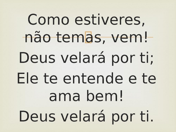 - Como estiveres, não temas, vem!Deus velará por ti;Ele te entende e te ama bem!Deus velará por ti.