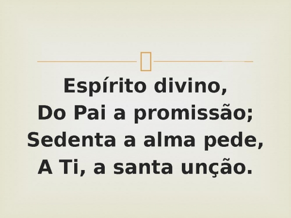 - Espírito divino,Do Pai a promissão;Sedenta a alma pede,A Ti, a santa unção.