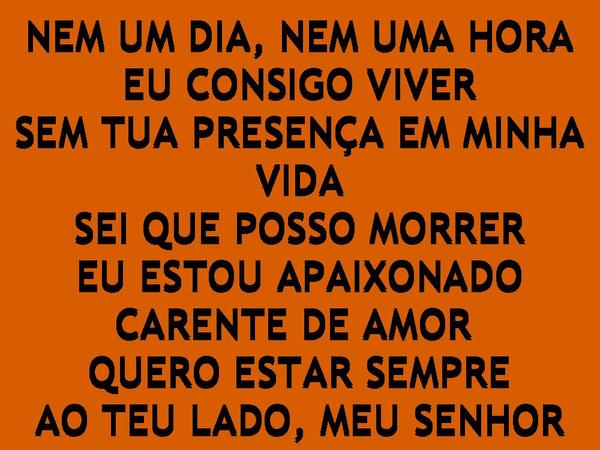 - NEM UM DIA, NEM UMA HORAEU CONSIGO VIVERSEM TUA PRESENÇA EM MINHA VIDASEI QUE POSSO MORREREU ESTOU APAIXONADOCARENTE DE AMOR QUERO ESTAR SEMPREAO TEU LADO, MEU SENHOR