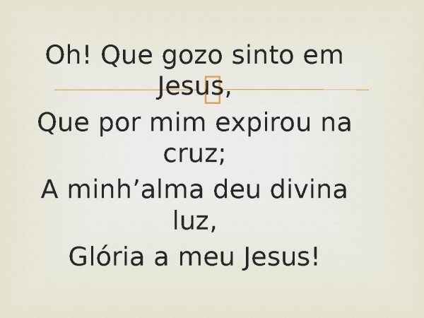 - Oh! Que gozo sinto em Jesus,Que por mim expirou na cruz;A minh’alma deu divina luz,Glória a meu Jesus!