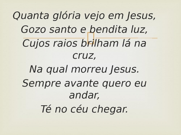 - Quanta glória vejo em Jesus,Gozo santo e bendita luz,Cujos raios brilham lá na cruz,Na qual morreu Jesus.Sempre avante quero eu andar,Té no céu chegar.