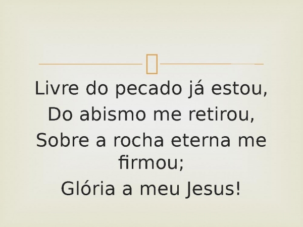 - Livre do pecado já estou,Do abismo me retirou,Sobre a rocha eterna me firmou;Glória a meu Jesus!
