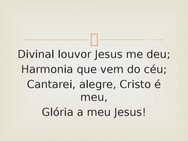 - Divinal louvor Jesus me deu;Harmonia que vem do céu;Cantarei, alegre, Cristo é meu,Glória a meu Jesus!