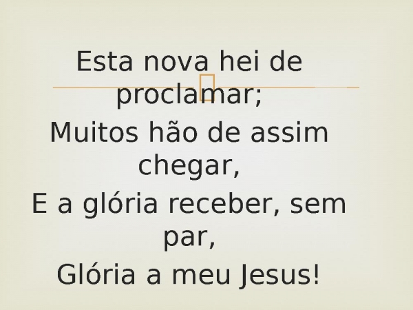 - Esta nova hei de proclamar;Muitos hão de assim chegar,E a glória receber, sem par,Glória a meu Jesus!