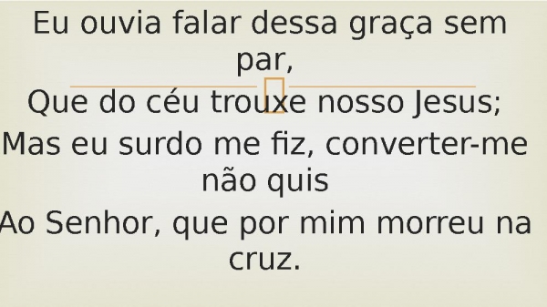 - Eu ouvia falar dessa graça sem par,Que do céu trouxe nosso Jesus;Mas eu surdo me fiz, converter-me não quisAo Senhor, que por mim morreu na cruz.