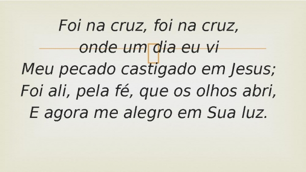 - Foi na cruz, foi na cruz,onde um dia eu viMeu pecado castigado em Jesus;Foi ali, pela fé, que os olhos abri,E agora me alegro em Sua luz.