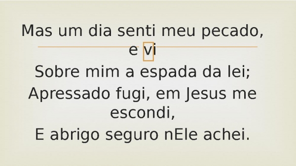 - Mas um dia senti meu pecado, e viSobre mim a espada da lei;Apressado fugi, em Jesus me escondi,E abrigo seguro nEle achei.