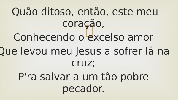- Quão ditoso, então, este meu coração,Conhecendo o excelso amorQue levou meu Jesus a sofrer lá na cruz;P'ra salvar a um tão pobre pecador.
