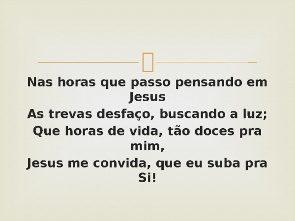 - Nas horas que passo pensando em JesusAs trevas desfaço, buscando a luz;Que horas de vida, tão doces pra mim,Jesus me convida, que eu suba pra Si!