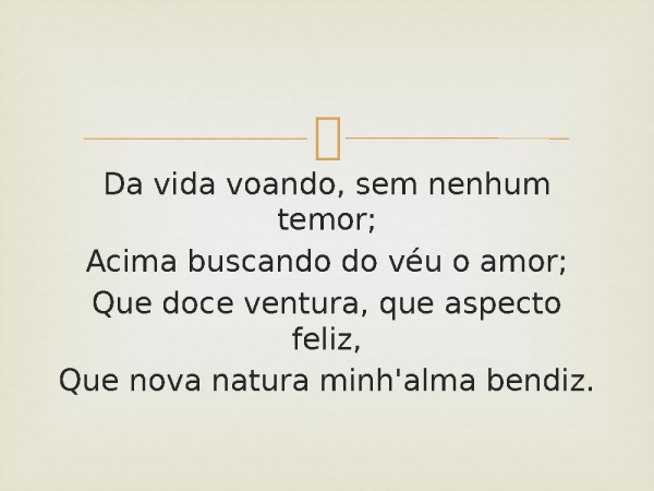 - Da vida voando, sem nenhum temor;Acima buscando do véu o amor;Que doce ventura, que aspecto feliz,Que nova natura minh'alma bendiz.