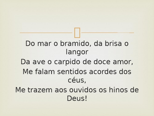 - Do mar o bramido, da brisa o langorDa ave o carpido de doce amor,Me falam sentidos acordes dos céus,Me trazem aos ouvidos os hinos de Deus!