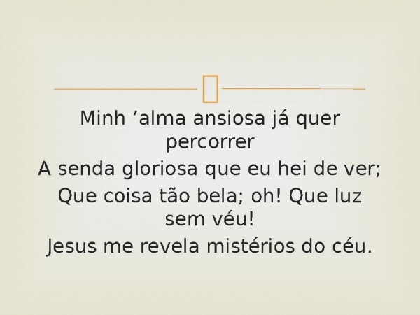 - Minh ’alma ansiosa já quer percorrerA senda gloriosa que eu hei de ver;Que coisa tão bela; oh! Que luz sem véu!Jesus me revela mistérios do céu.