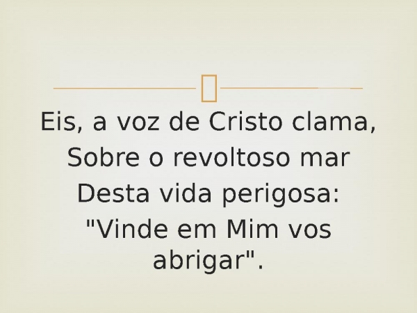 - Eis, a voz de Cristo clama,Sobre o revoltoso marDesta vida perigosa:"Vinde em Mim vos abrigar".