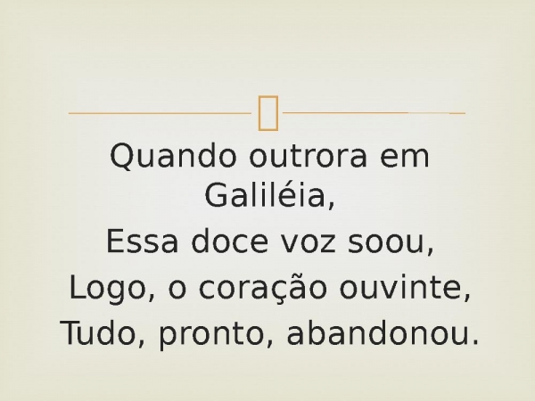 - Quando outrora em Galiléia,Essa doce voz soou,Logo, o coração ouvinte,Tudo, pronto, abandonou.