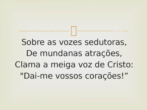 - Sobre as vozes sedutoras,De mundanas atrações,Clama a meiga voz de Cristo:"Dai-me vossos corações!”