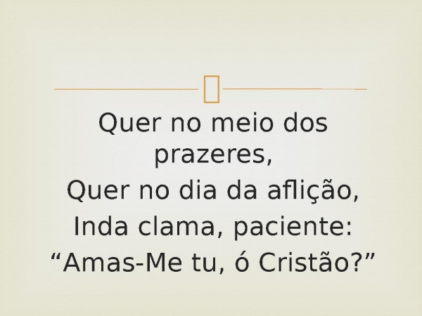 - Quer no meio dos prazeres,Quer no dia da aflição,Inda clama, paciente:“Amas-Me tu, ó Cristão?”