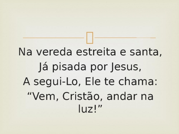 - Na vereda estreita e santa,Já pisada por Jesus,A segui-Lo, Ele te chama:“Vem, Cristão, andar na luz!”