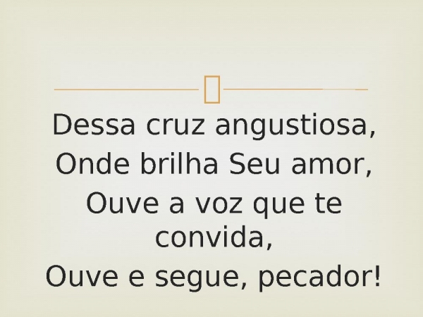- Dessa cruz angustiosa,Onde brilha Seu amor,Ouve a voz que te convida,Ouve e segue, pecador!