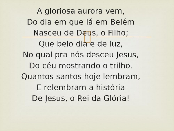 - A gloriosa aurora vem,Do dia em que lá em BelémNasceu de Deus, o Filho;Que belo dia e de luz,No qual pra nós desceu Jesus,Do céu mostrando o trilho.Quantos santos hoje lembram,E relembram a históriaDe Jesus, o Rei da Glória!