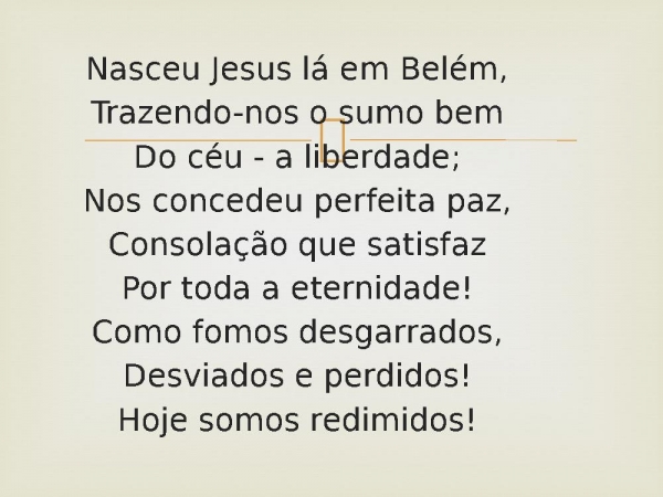 - Nasceu Jesus lá em Belém,Trazendo-nos o sumo bemDo céu - a liberdade;Nos concedeu perfeita paz,Consolação que satisfazPor toda a eternidade!Como fomos desgarrados,Desviados e perdidos!Hoje somos redimidos!